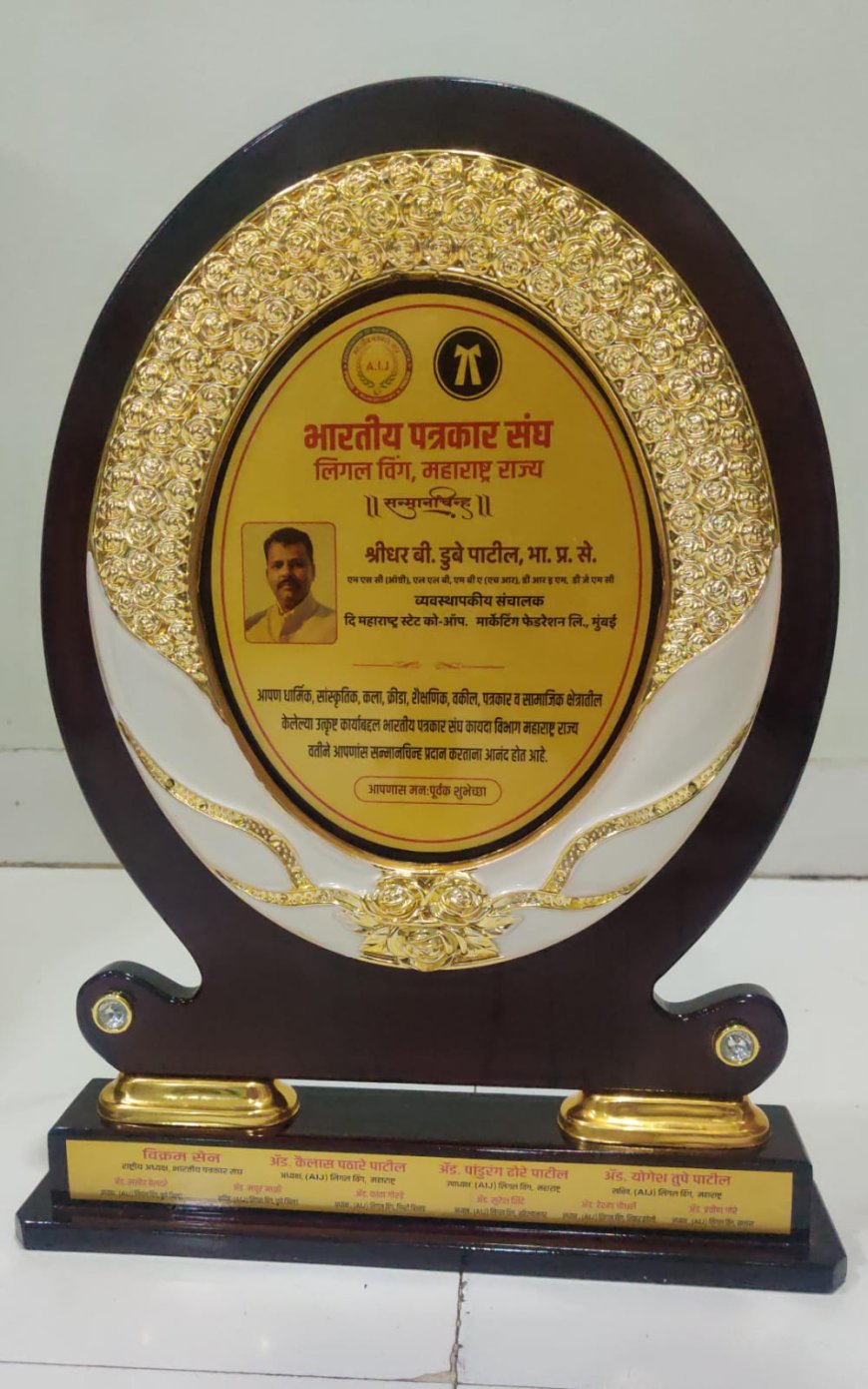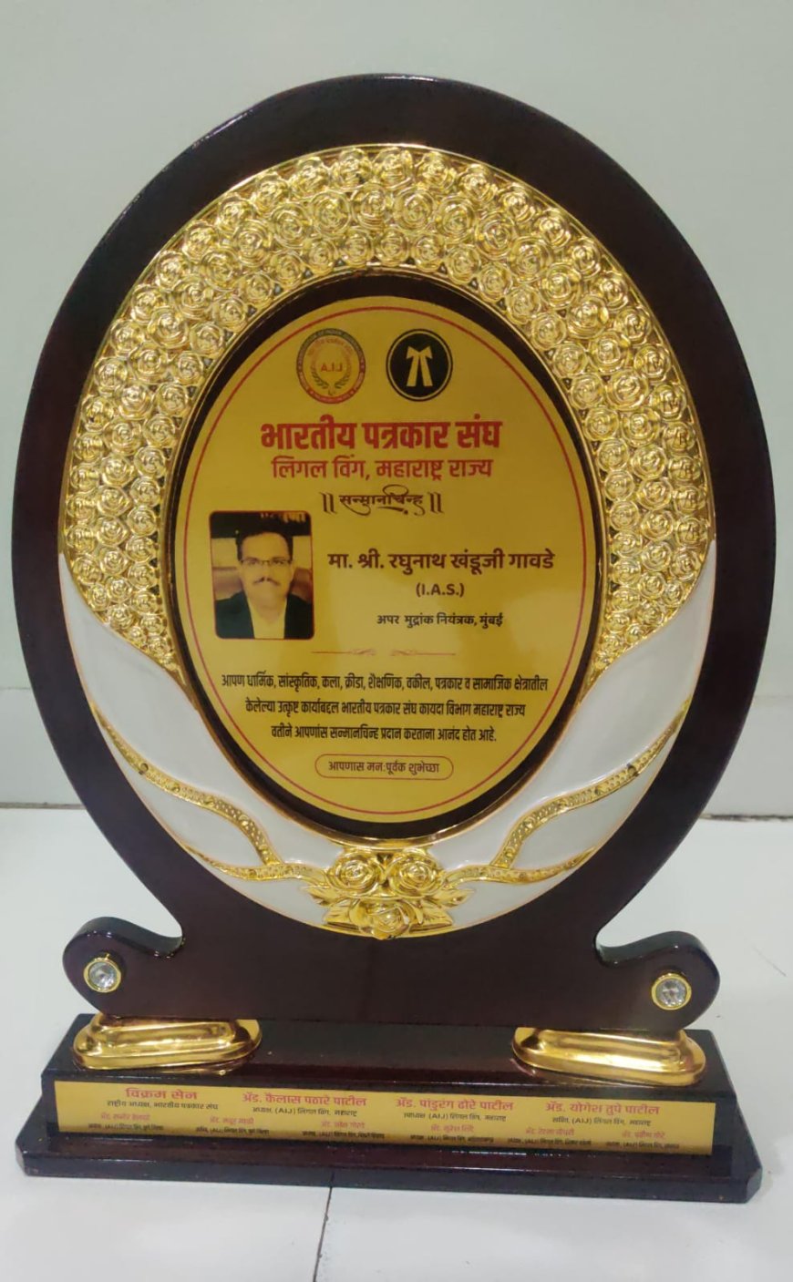 भारतीय पत्रकार संघ लिगल विंग महाराष्ट्र राज्याच्या वतीने आयोजित विशेष कार्यक्रमात राज्यातील दोन उच्चस्तरीय आणि कार्यक्षम प्रशासकीय अधिकारी — आय.ए.एस. श्री रघुनाथ गावडे (अपर मुद्रांक नियंत्रक, मुंबई) व आय.ए.एस. श्री श्रीधर डुबे-पाटील (व्यवस्थापकीय संचालक, महाराष्ट्र स्टेट को-ऑपरेटिव्ह मार्केटिंग फेडरेशन लिमिटेड, मुंबई) — यांचा त्यांच्या उत्कृष्ट प्रशासकीय कारकिर्दीची आणि जनहितासाठी केलेल्या उल्लेखनीय कार्याची दखल घेऊन सन्मान करण्यात आला.